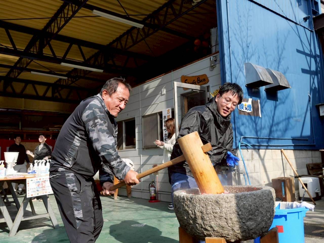 40キロのもち米を搗ききれないため、ご来場の皆様にもお手伝いいただき