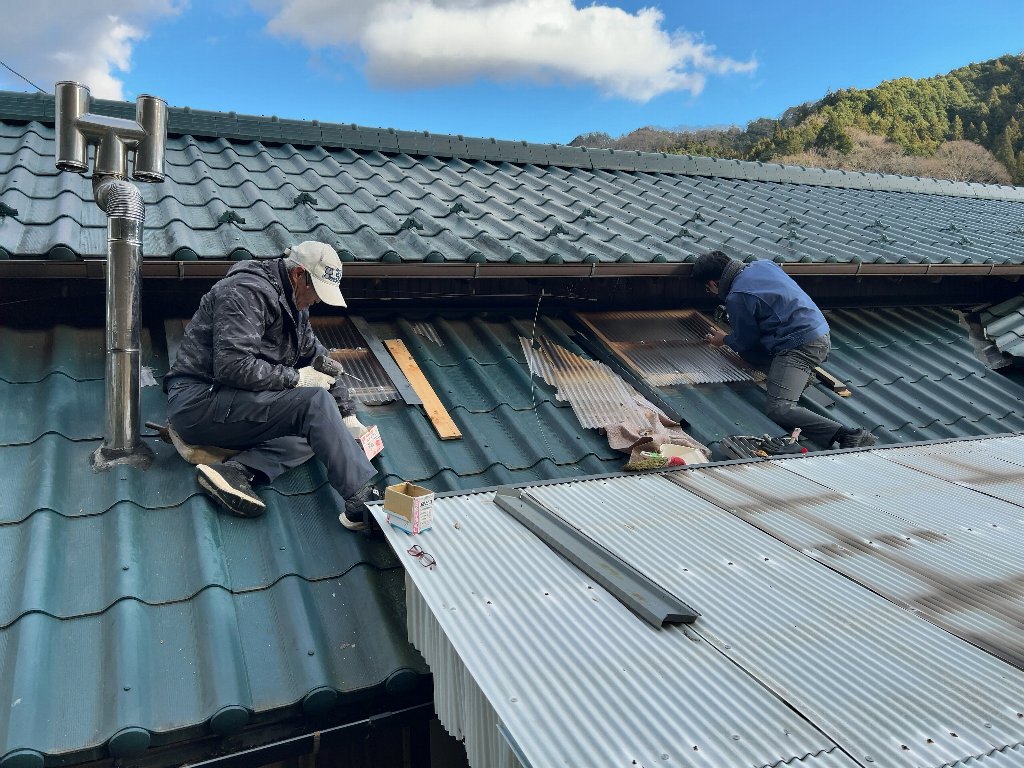 屋根の明り取りは紫外線で劣化していたので、新しいポリカーボネートの波板を張り替えました。私も一緒に作業を行いましたが、、、屋根上での作業は足腰に効きます!