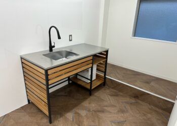 打合せ室入り口にはミニキッチンも設置し、お茶出しの対応もスムーズに行えるようにしています。
